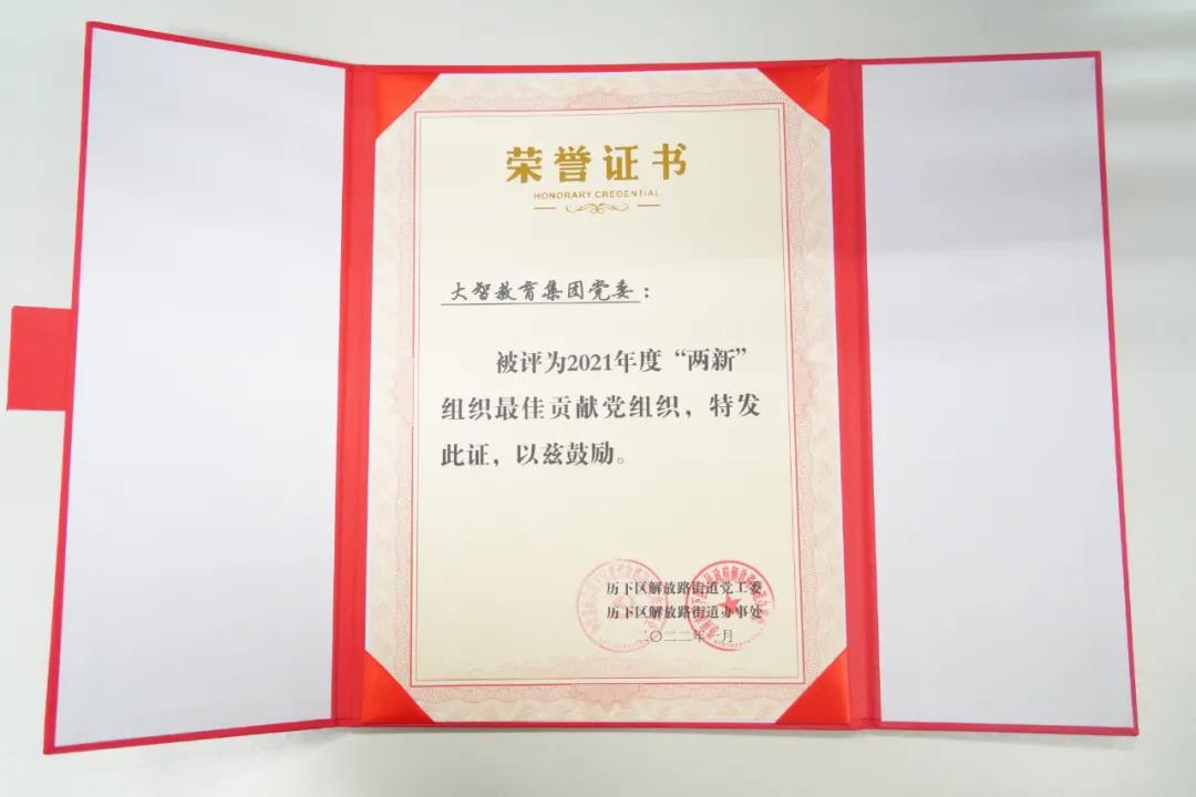 近日,大智教育集團黨委被評為2021年度“兩新”組織最佳貢獻黨組織。