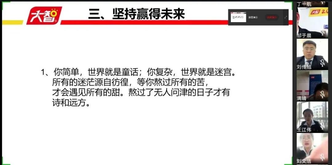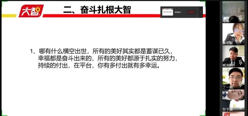 3月25日下午,大智教育集團(tuán)黨委委員、小班黨支部書記楊愛彬,為大智黨員們帶來“向陽計(jì)劃”第三講精彩內(nèi)容分享——《大智助我成長》。部分黨員在現(xiàn)場參加培訓(xùn),其他各區(qū)域(公司)的黨員們通過視頻連線的方式參加培訓(xùn)。