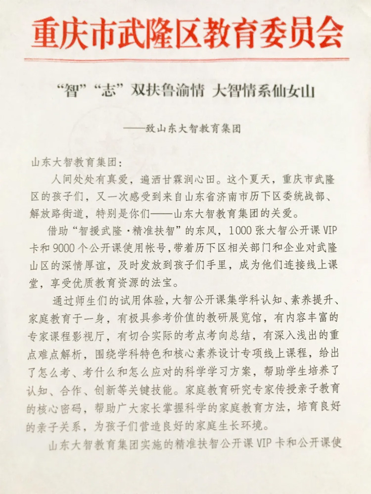 08月24日,重慶市武隆區(qū)教育委員會(huì)給大智寫來(lái)感謝信,就大智為武隆區(qū)學(xué)校公益捐贈(zèng)大智公開(kāi)課VIP卡表示感謝。為深入貫徹落實(shí)習(xí)近平總書記“扶貧...