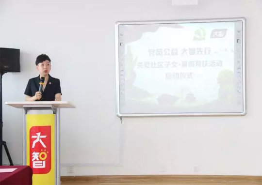 07月24日,由濟(jì)南市歷下區(qū)解放路街道黨工委聯(lián)合大智小班黨支部發(fā)起的“黨員公益 大智先行——關(guān)愛社區(qū)子女”暑假幫扶活動(dòng)啟動(dòng)儀式在大智控股集團(tuán)總部舉行。解放路街道青龍街社區(qū)居委會(huì)副主任張蕊等領(lǐng)導(dǎo),大智控股集團(tuán)黨委委員、濟(jì)南區(qū)域總校長(zhǎng)宋靜文,接受幫扶的社區(qū)家長(zhǎng)和孩子以及小班黨支部代表參加了儀式。