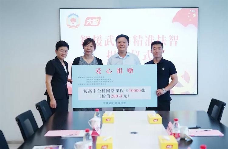 儀式上,大智為歷下區(qū)委統(tǒng)戰(zhàn)部在東西部扶貧協(xié)作中對(duì)口幫扶的重慶武隆區(qū)捐贈(zèng)總價(jià)值280萬(wàn)元的大智公開(kāi)課(初高中全科網(wǎng)絡(luò)課程)VIP卡10000張。