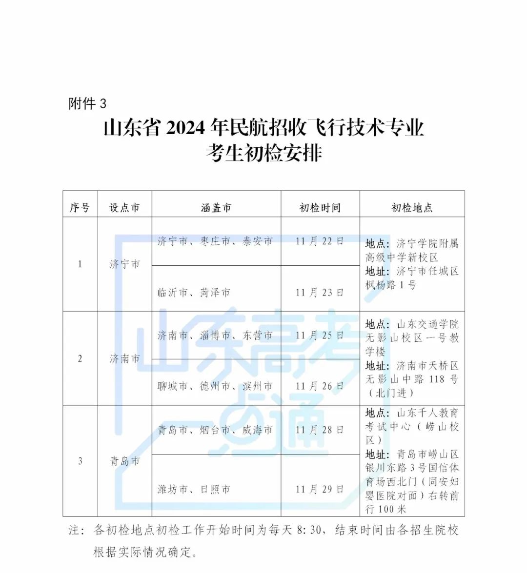 (二)初檢預(yù)選。招飛各項選拔工作由各院校具體組織實施。我省在濟南、青島、濟寧3市設(shè)立招飛初檢站,各招生院校按照規(guī)定時間在每個初檢站分別組織初檢預(yù)選工作,具體時間地點安排見附件3??忌殧y帶身份證及報考院校規(guī)定的證件材料等,按照附件3規(guī)定的時間地點到達指定初檢站,參加擬報考院校組織的民航飛行技術(shù)專業(yè)的初檢預(yù)選。