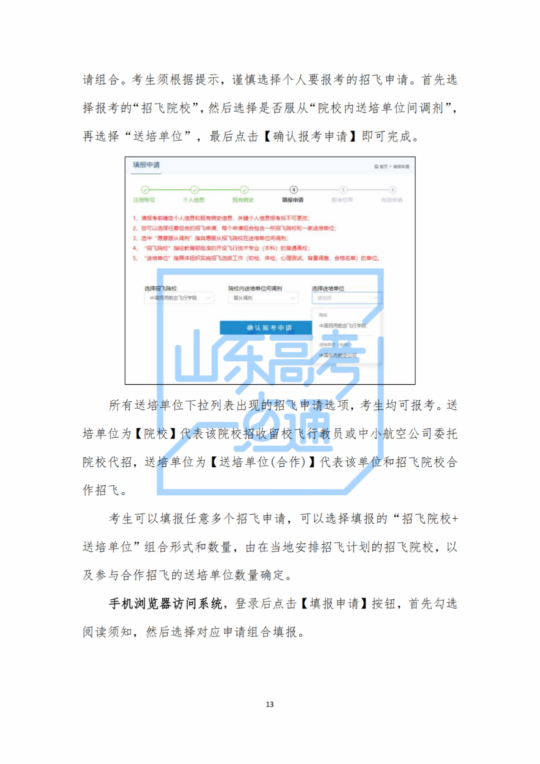 送培單位在招飛院校的組織下開展招飛工作。送培單位的招飛主管將聯(lián)系您參加各項選拔工作,并在招飛系統(tǒng)中對您報考本單位的相關(guān)信息及結(jié)果進行設(shè)置、審核、跟蹤等。請注意,當(dāng)您在招飛系統(tǒng)中選擇的送培單位為招飛院校時,表示您畢業(yè)后的工作單位由招飛院校負責(zé)確定,或者留在學(xué)校成為飛行教員,由招飛院校的招飛主管負責(zé)您的選拔工作。當(dāng)您在招飛系統(tǒng)中選擇送培單位為送培單位(合作)時,表明在您的生源地送培單位由招飛院校主導(dǎo)參與合作招飛,由送培單位的招飛主管經(jīng)招飛院校授權(quán)后,負責(zé)您的選拔工作。