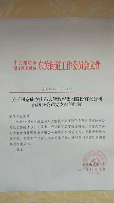 10月19日,中共濰坊市奎文區(qū)東關(guān)街道工作委員會同意成立山東大智控股集團(tuán)股份有限公司濰坊分公司黨支部。黨支部書記由張成斌同志擔(dān)任。這是大智控...