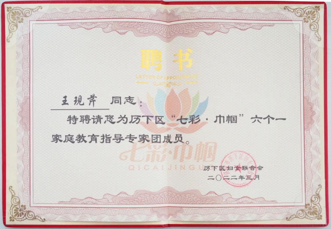 王現(xiàn)芹被聘為歷下區(qū)“七彩•巾幗”六個一家庭教育指導(dǎo)專家團(tuán)成員,她表示,將堅持落實(shí)習(xí)總書記關(guān)于“注重家庭、注重家教、注重家風(fēng)”的重要論述,全方位解讀家庭、家教、家風(fēng)話題和家庭建設(shè)的深刻內(nèi)涵,當(dāng)好家庭建設(shè)的“指導(dǎo)員”。