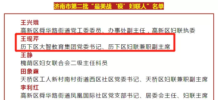 近日,濟(jì)南市婦聯(lián)公布了第二批最美戰(zhàn)“疫”巾幗典型,大智控股集團(tuán)黨委書(shū)記、婦聯(lián)主席王現(xiàn)芹被評(píng)為濟(jì)南市第二批“最美戰(zhàn)‘疫’婦聯(lián)人”。在疫情防控第...
