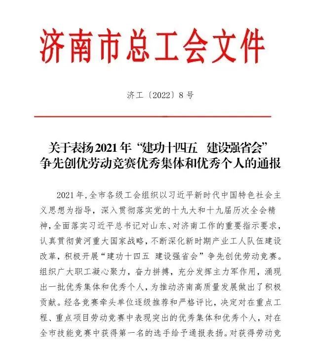 近日,濟南市總工會印發(fā)《關(guān)于表揚2021年“建功十四五 建設(shè)強省會”爭先創(chuàng)優(yōu)勞動競賽優(yōu)秀集體和優(yōu)秀個人的通報》,山東大智控股集團股份有限公司課程研究院榮獲2021年“建功十四五 建設(shè)強省會”爭先創(chuàng)優(yōu)勞動競賽一等獎。