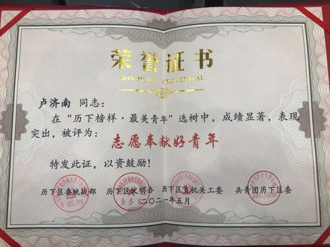 同時(shí),大智(濟(jì)南)智學(xué)智愛志愿服務(wù)隊(duì)領(lǐng)隊(duì)盧濟(jì)南榮獲“志愿奉獻(xiàn)好青年”榮譽(yù)稱號(hào)。