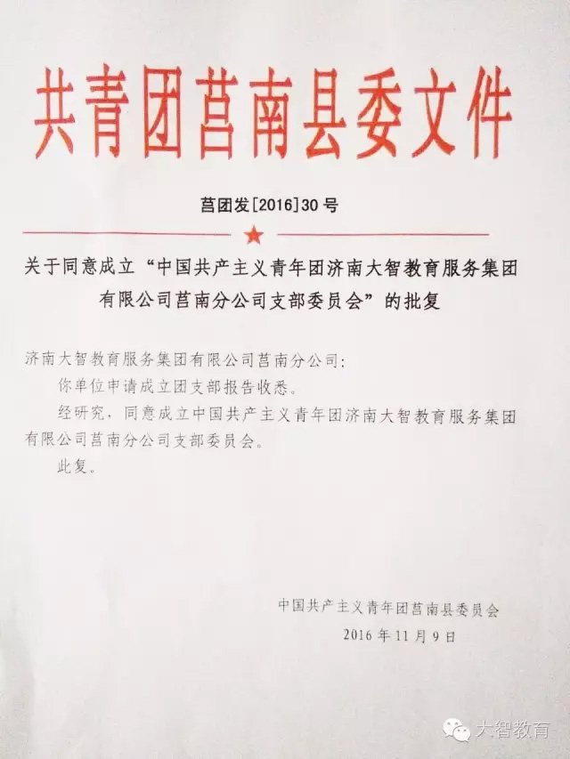 11月09日,中國共產(chǎn)主義青年團(tuán)莒南縣委員會(huì)正式批復(fù)同意成立“中國共產(chǎn)主義青年團(tuán)濟(jì)南大智教育服務(wù)集團(tuán)有限公司莒南分公司支部委員會(huì)”。莒南分公司團(tuán)支部是繼淄博、臨沂之后,大智成立的第三個(gè)區(qū)域團(tuán)支部,將對大智今后的發(fā)展及各項(xiàng)工作的開展產(chǎn)生積極推動(dòng)作用。