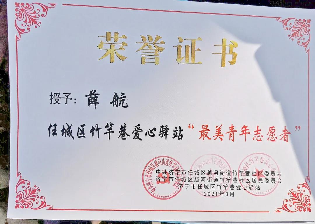 濟(jì)寧區(qū)域團(tuán)支部聯(lián)合竹竿巷社區(qū)、蔣林社區(qū)、濟(jì)寧市雷鋒紀(jì)念館、濟(jì)寧市黨章石刻館、濟(jì)寧市青年志愿者協(xié)會(huì)開展“慶建黨百年,弘揚(yáng)雷鋒精神”公益活動(dòng),南池分校市場(chǎng)專員薛航家人被越河街道評(píng)選為“優(yōu)秀青年志愿者。”