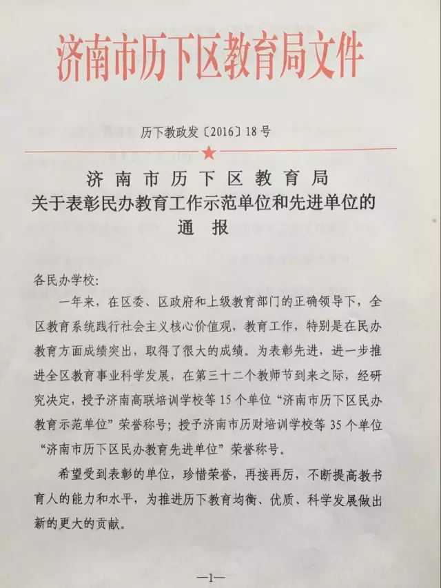 日前,濟(jì)南市歷下區(qū)教育局下發(fā)《濟(jì)南市歷下區(qū)教育局關(guān)于表彰民辦教育工作示范單位和先進(jìn)單位的通報(bào)》,大智憑借優(yōu)質(zhì)的教學(xué)服務(wù)、規(guī)范的教學(xué)管理以及優(yōu)異的教學(xué)成績(jī)榮獲“濟(jì)南市歷下區(qū)民辦教育示范單位”榮譽(yù)稱(chēng)號(hào)。