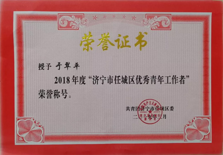 近日,大智濟(jì)寧區(qū)域團(tuán)總支被共青團(tuán)濟(jì)寧市任城區(qū)委評(píng)為“濟(jì)寧市任城區(qū)紅旗團(tuán)總支”,團(tuán)總支書(shū)記于翠平被評(píng)為“2018年度濟(jì)寧市任城區(qū)優(yōu)秀青年工作者”。