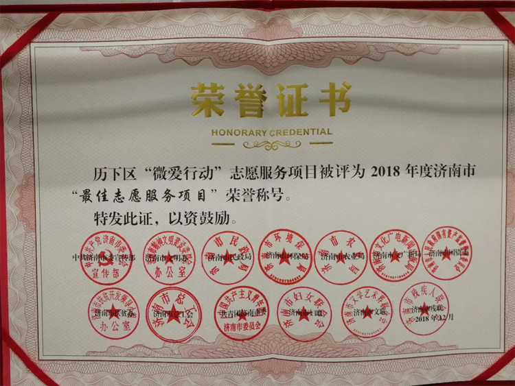 大智“微愛(ài)行動(dòng)”志愿服務(wù)項(xiàng)目被授予“山東省2018年度最佳志愿服務(wù)項(xiàng)目”和“2018年度濟(jì)南市最佳志愿服務(wù)項(xiàng)目”榮譽(yù)稱(chēng)號(hào)。