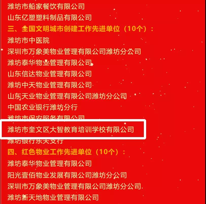 自濰坊市文明城市創(chuàng)建以來,大智濰坊區(qū)域拼搏實干,奮勇爭先,做文明創(chuàng)城的宣傳者、踐行者,落實疫情防控工作,深化精神文明創(chuàng)建,積極踐行社會責(zé)任,營造了向上向善、文明安全的良好氛圍。近日,大智濰坊區(qū)域榮獲“2020年度全國文明城市創(chuàng)建工作先進單位”稱號。