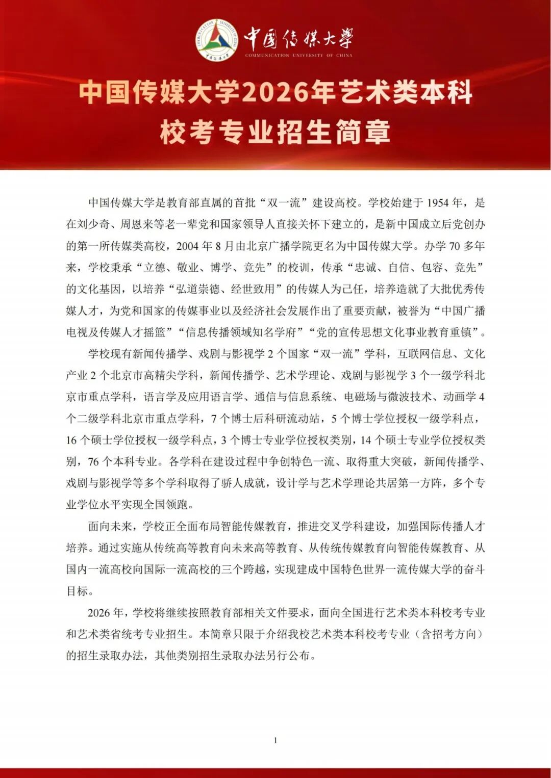 剛剛,中國傳媒大學公布2026年藝術類本科??紝I(yè)招生簡章。明確:報名時間:2026年1月17日10:00-2026年1月22日18:00線...