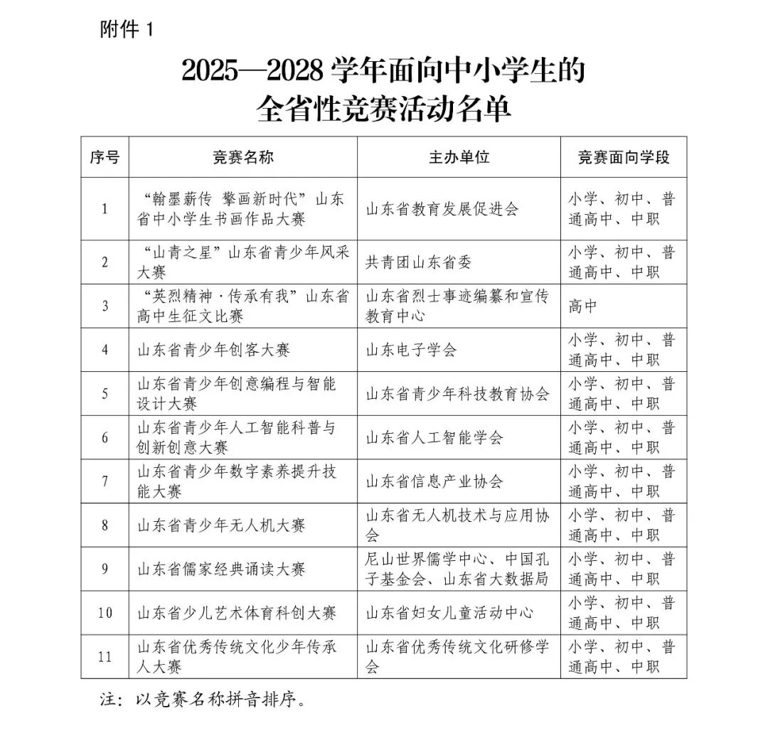 山東省教育廳關(guān)于公布2025—2028學(xué)年面向中小學(xué)生的全省性競賽活動(dòng)和全國性競賽活動(dòng)在我省備案名單的通知魯教監(jiān)管字〔2026〕1號(hào)各市教育...