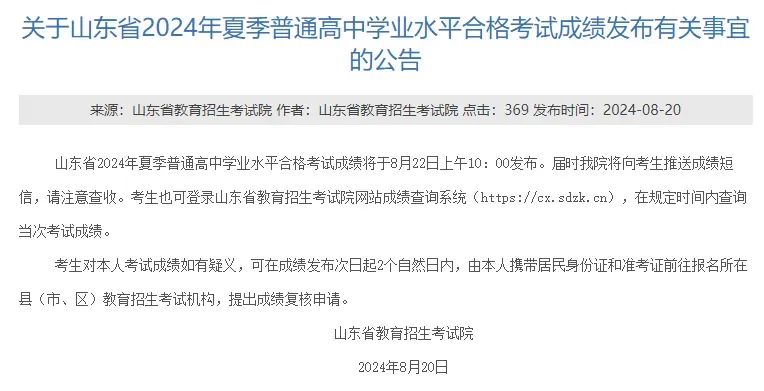山東省2024年夏季普通高中學(xué)業(yè)水平合格考試成績于8月22日(今日)10:00發(fā)布。考生可登錄山東省教育招生考試院網(wǎng)站(https://ww...