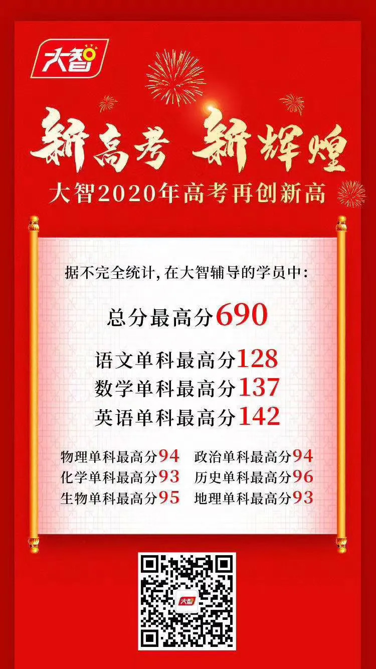 9. 2020年,大智中高考再創(chuàng)新高。據(jù)不完全統(tǒng)計,在大智輔導的高考學員中總分最高分690分,高考科目中語文單科最高分128分,數(shù)學單科最高分137分,英語單科最高分142分;等級考科目中物理單科最高分94分,化學單科最高分93分,生物單科最高分95分,政治單科最高分94分,歷史單科最高分96分,地理單科最高分93分。中考學員的進步率、升學率、滿意率等各項指標也在各地市位居前列。