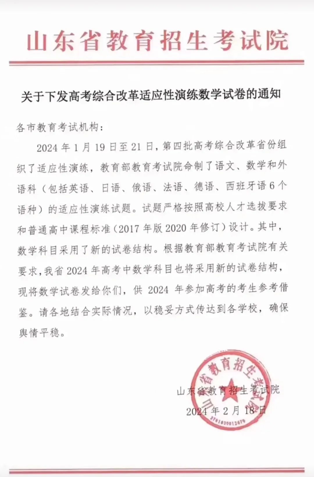 近日,山東省教育招生考試院發(fā)布的《關(guān)于下發(fā)高考綜合改革適應(yīng)性演練數(shù)學試卷的通知》。