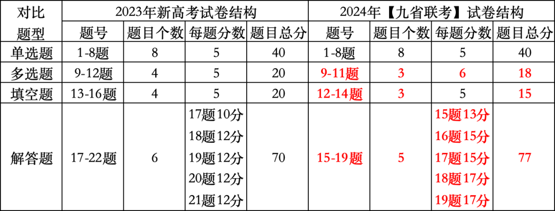 首先,相較于2023年高考,試卷結(jié)構(gòu)發(fā)生很大變化,小題分值大幅減少,大題題量減少,但是難度和分值都增加。