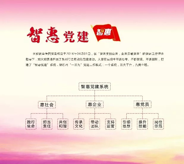 “智惠黨建一三九”工作模式,即一個系統(tǒng)、三大平臺、九類主題項目。