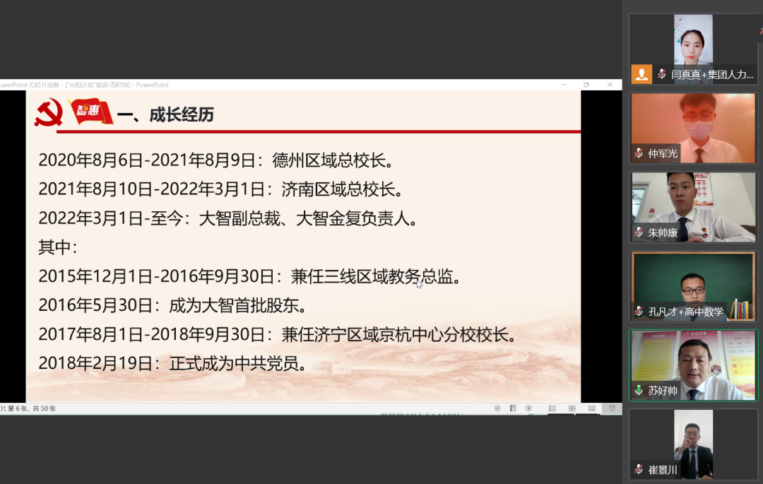 4月29日,大智控股集團(tuán)副總裁蘇好帥為大智黨員們帶來了2021-2022財(cái)年“向陽計(jì)劃”專項(xiàng)培訓(xùn)第五講精彩內(nèi)容分享——《不忘初心 方得始終》。黨員通過視頻連線方式參加培訓(xùn)。